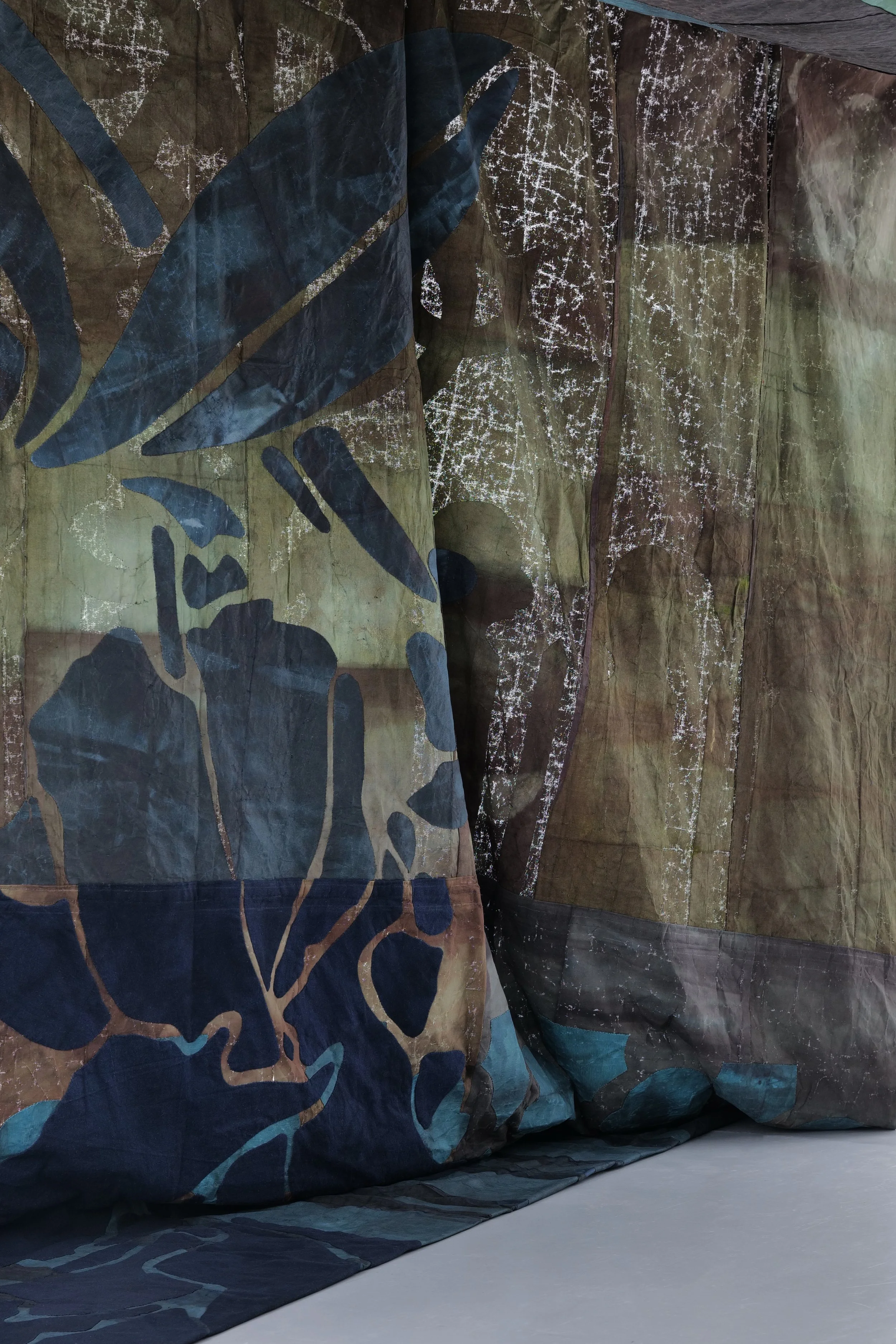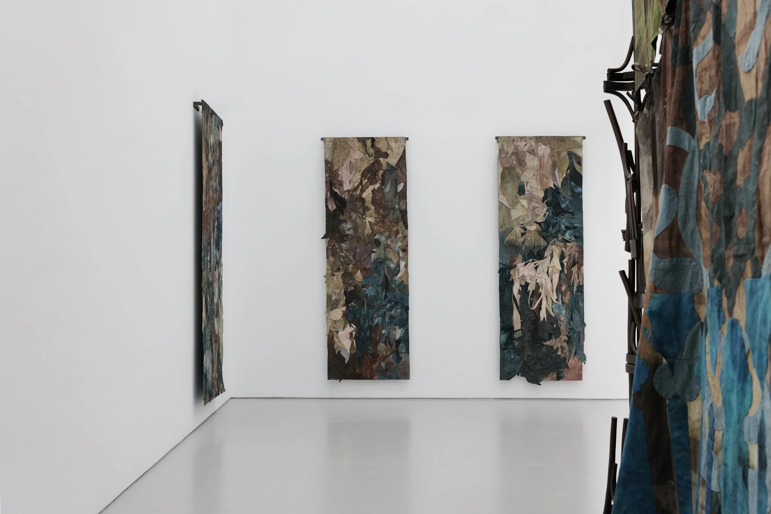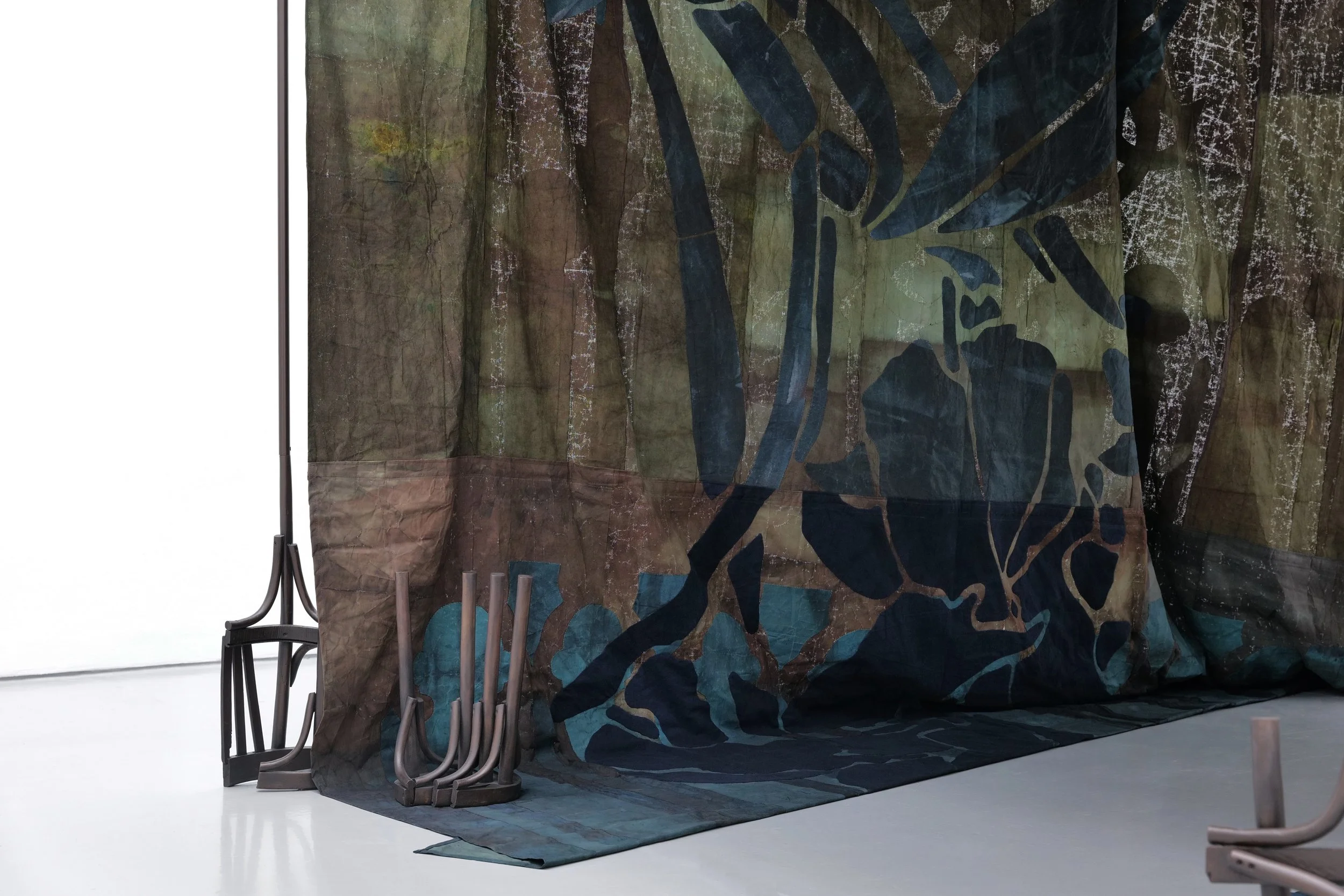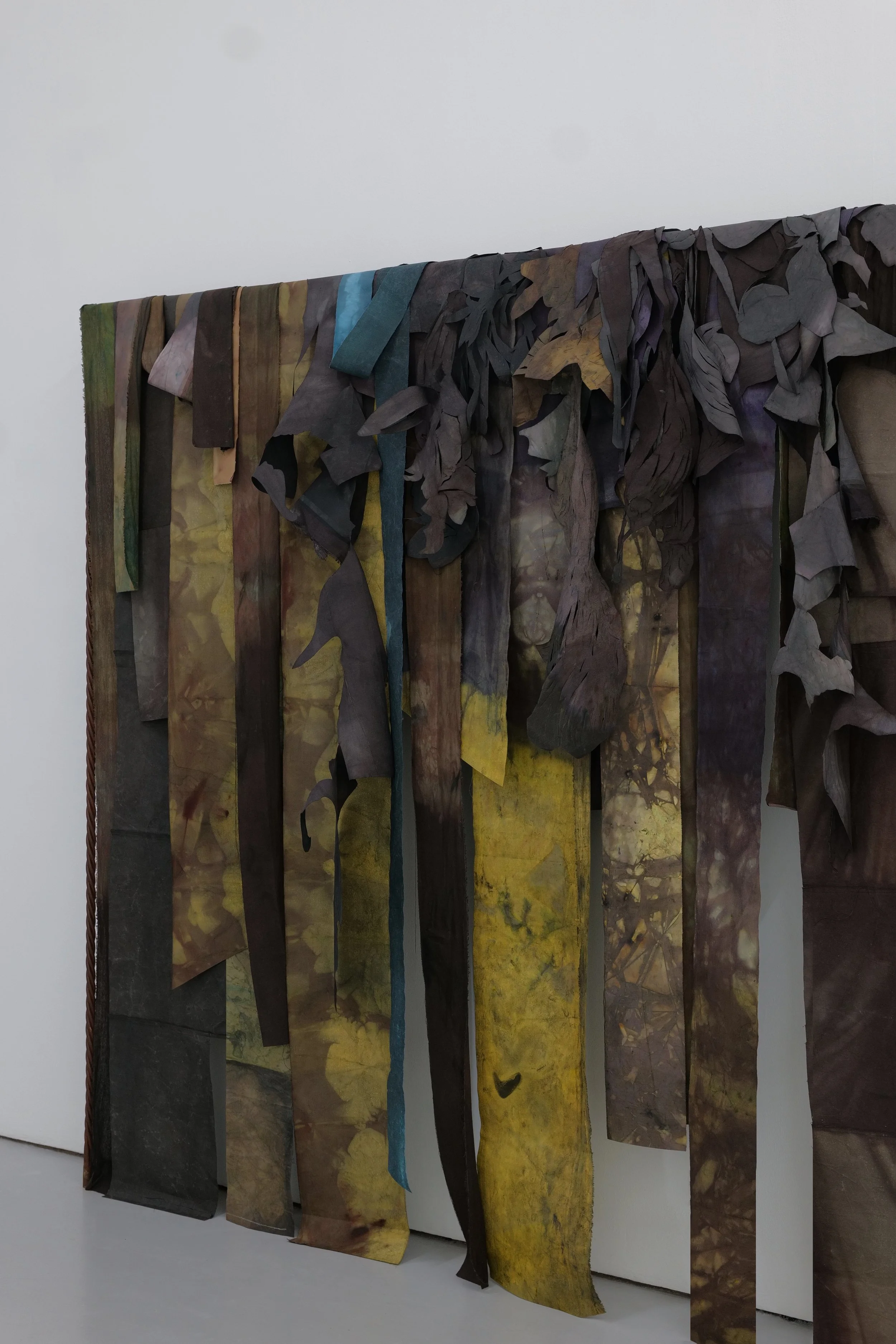 Fig trees belonging to the artist’s grandmother in Benghazi, Libya lend their poetic impetus for the three textiles displayed in the Biennale. Strongly attached to place, trees hold and embody memories. Jaouda recreates their botanical elements through cloth she deconstructs, dyes in earthen tones, and resews into sculptural tapestries. She draws from the personification of olive trees by Palestinian poet Mahmoud Darwish in conceptualization and title. Threading these works are notions of rootlessness and resilience, destruction and regeneration, and timelessness. The vegetal dyes possess their own force and unpredictability to activate the work. Jaouda’s sumptuously layered fabrics reverberate with colors at once deep and ethereal, shadowy and luminescent, as infinitely textured as memory itself.