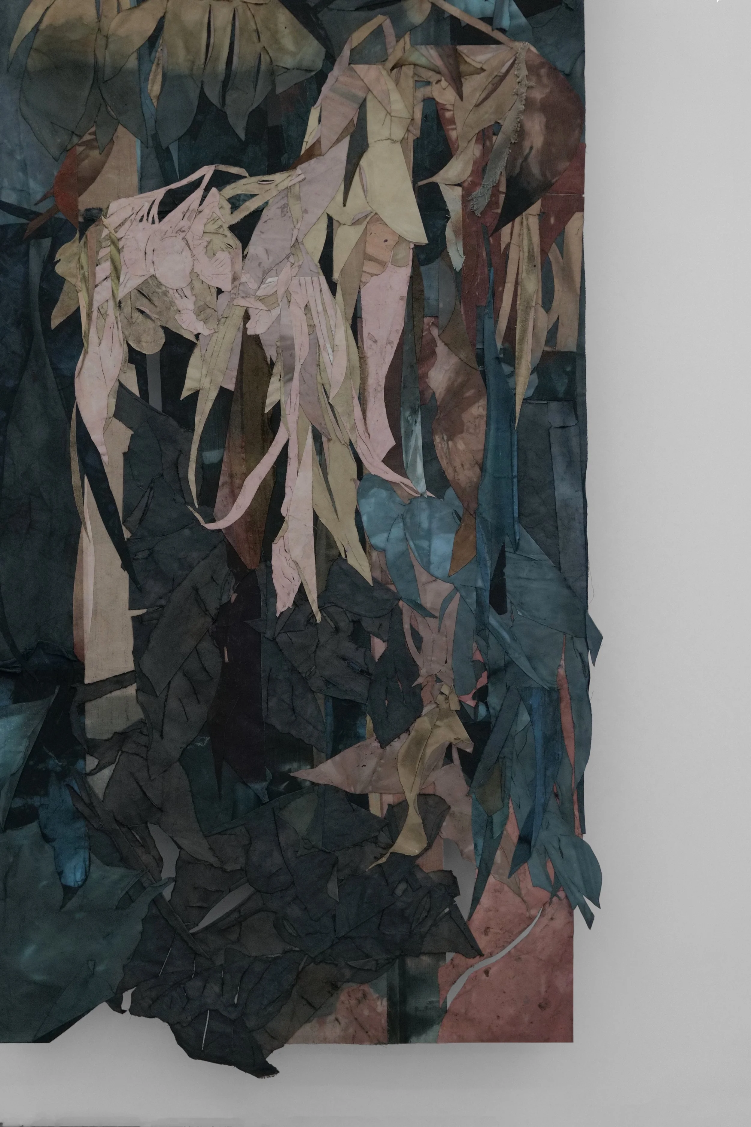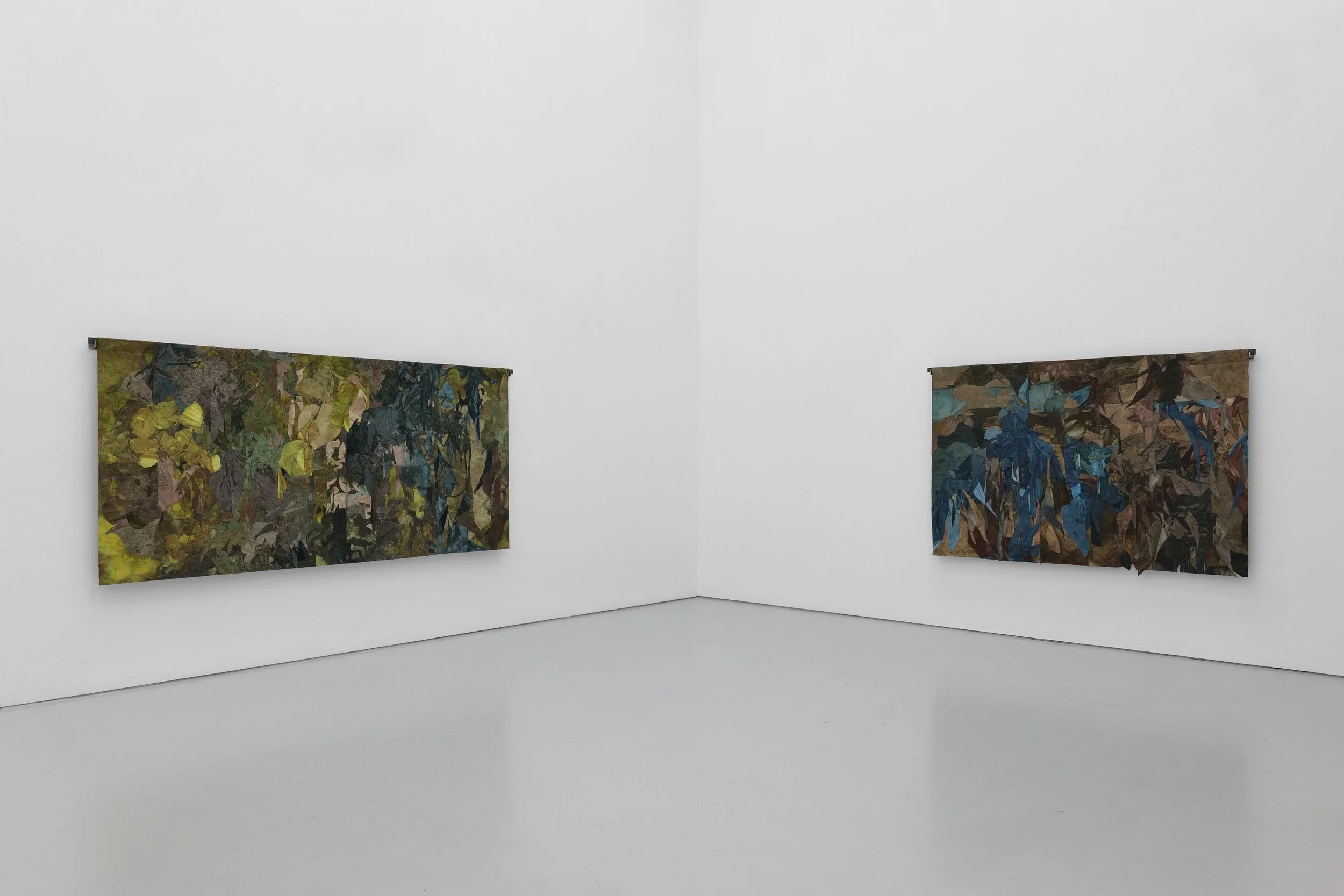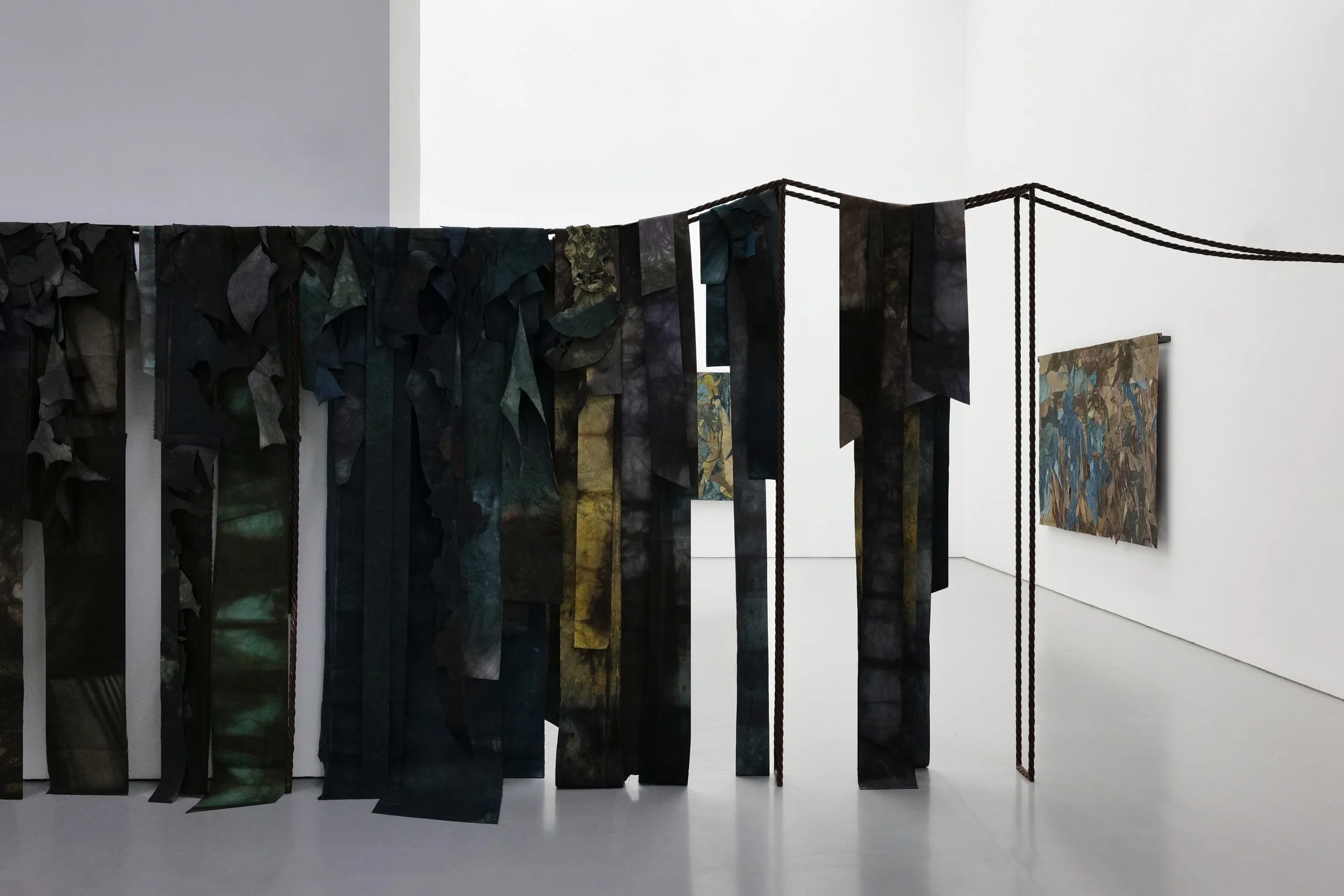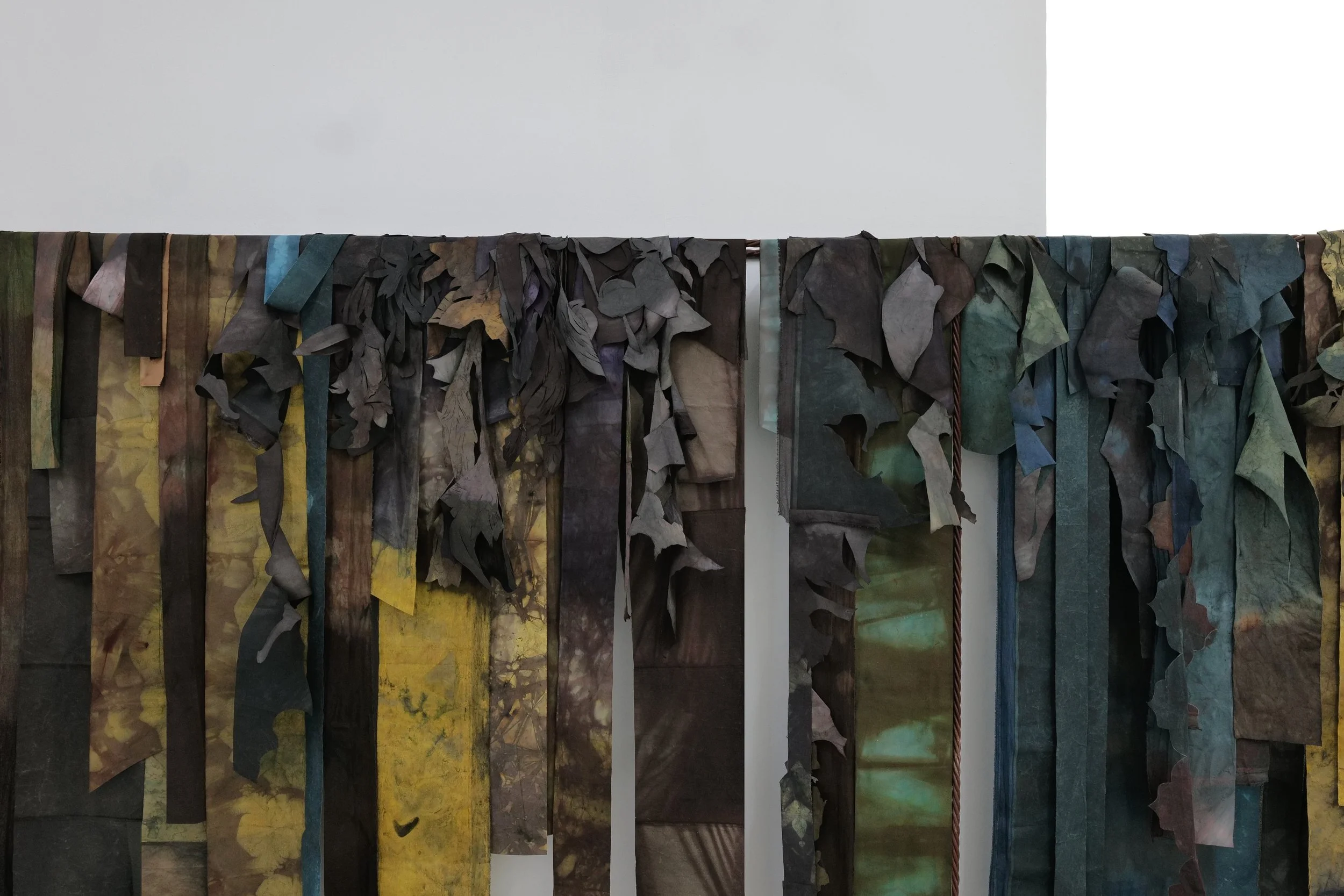 Fig trees belonging to the artist’s grandmother in Benghazi, Libya lend their poetic impetus for the three textiles displayed in the Biennale. Strongly attached to place, trees hold and embody memories. Jaouda recreates their botanical elements through cloth she deconstructs, dyes in earthen tones, and resews into sculptural tapestries. She draws from the personification of olive trees by Palestinian poet Mahmoud Darwish in conceptualization and title. Threading these works are notions of rootlessness and resilience, destruction and regeneration, and timelessness. The vegetal dyes possess their own force and unpredictability to activate the work. Jaouda’s sumptuously layered fabrics reverberate with colors at once deep and ethereal, shadowy and luminescent, as infinitely textured as memory itself.