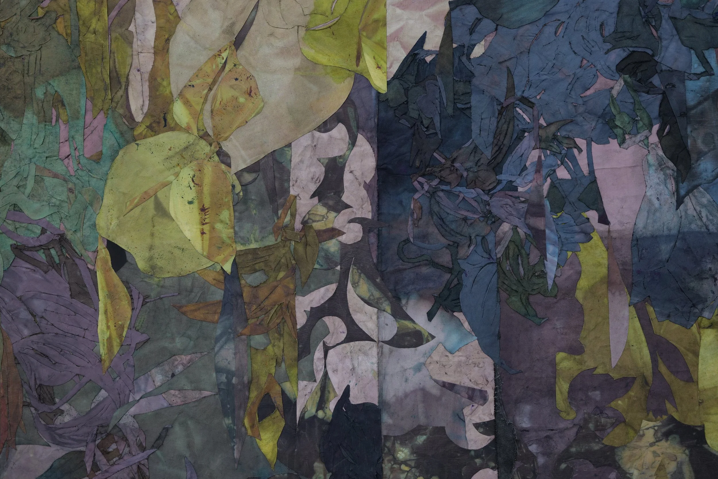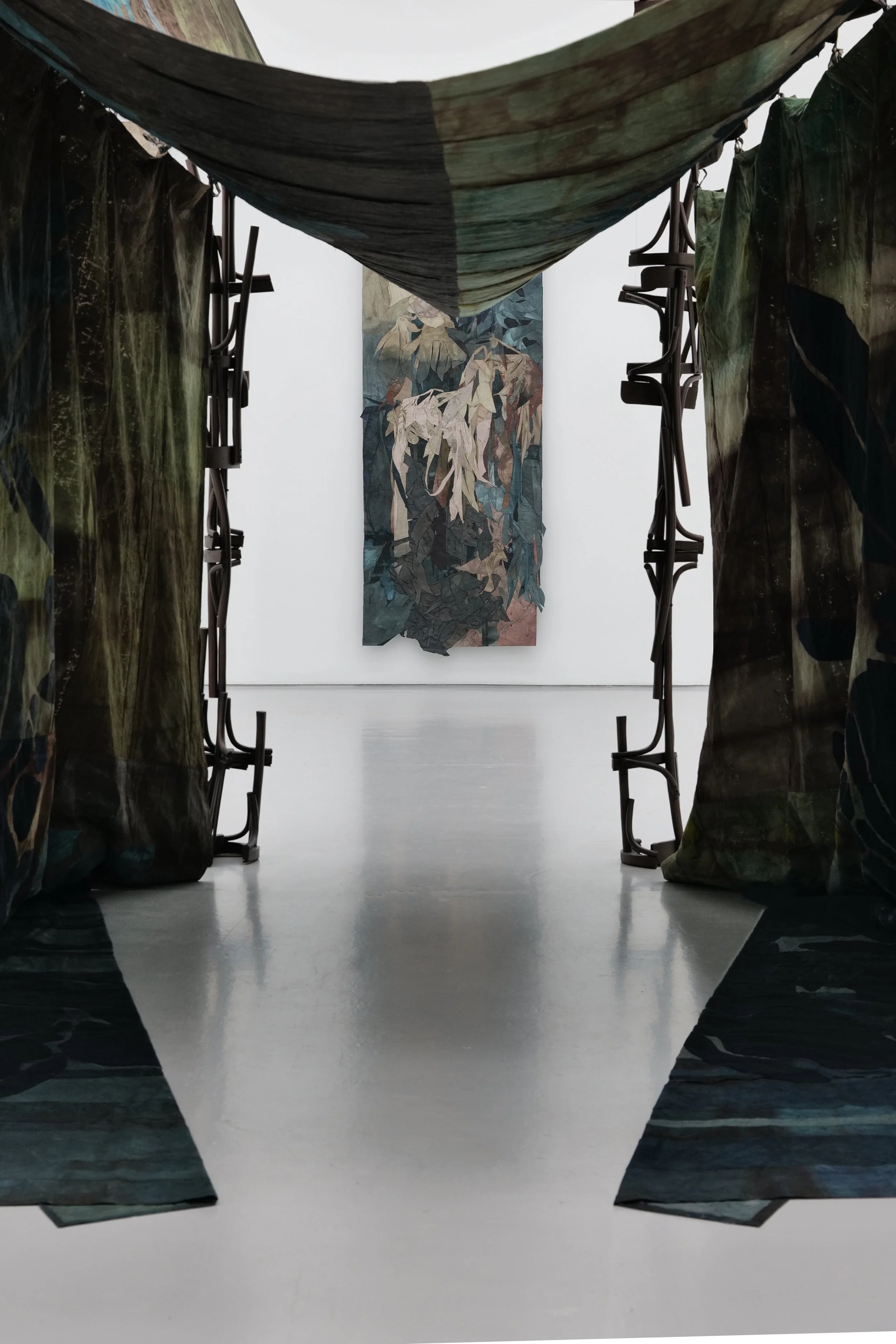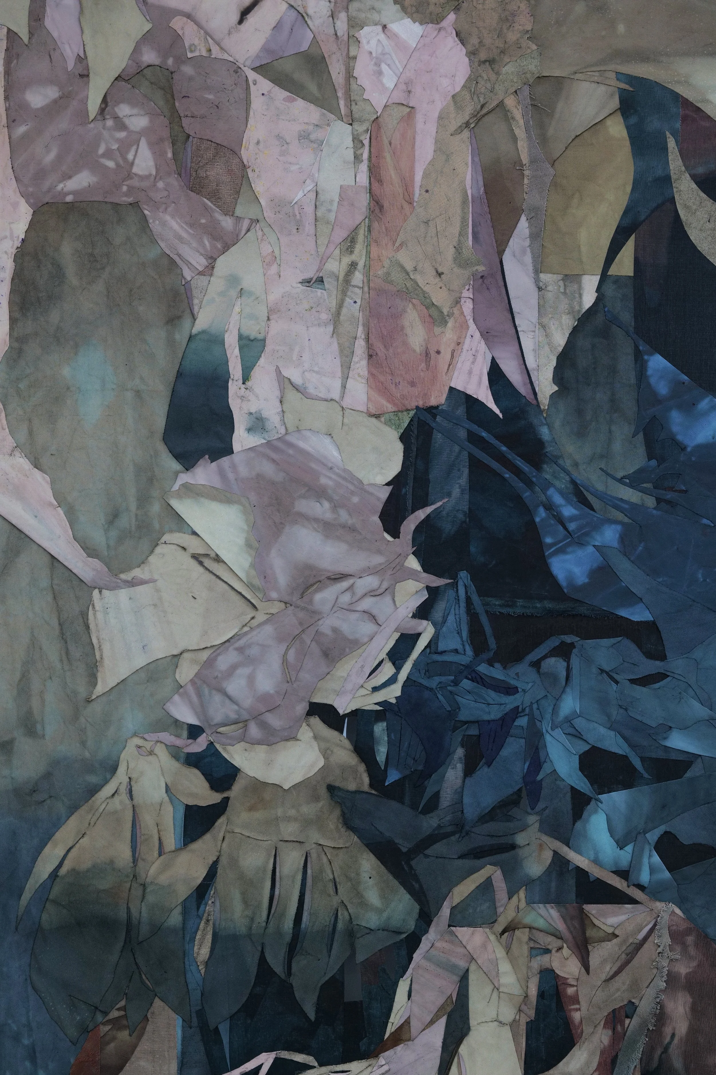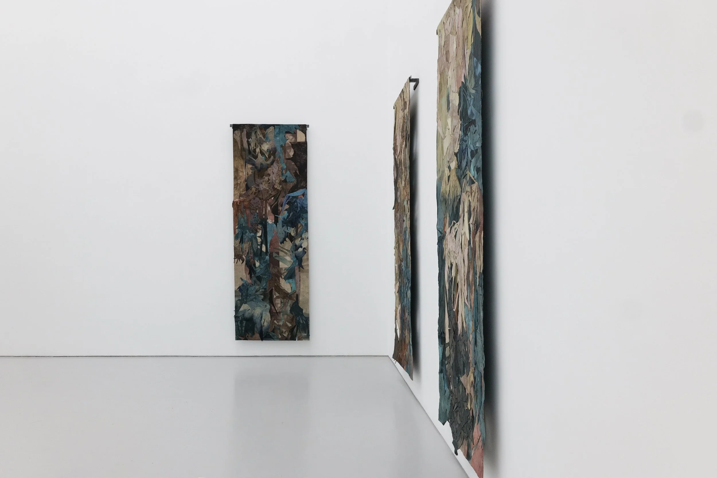 Fig trees belonging to the artist’s grandmother in Benghazi, Libya lend their poetic impetus for the three textiles displayed in the Biennale. Strongly attached to place, trees hold and embody memories. Jaouda recreates their botanical elements through cloth she deconstructs, dyes in earthen tones, and resews into sculptural tapestries. She draws from the personification of olive trees by Palestinian poet Mahmoud Darwish in conceptualization and title. Threading these works are notions of rootlessness and resilience, destruction and regeneration, and timelessness. The vegetal dyes possess their own force and unpredictability to activate the work. Jaouda’s sumptuously layered fabrics reverberate with colors at once deep and ethereal, shadowy and luminescent, as infinitely textured as memory itself.